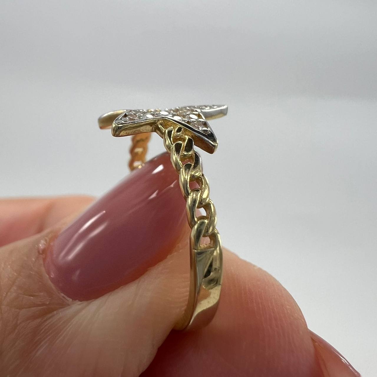 This elegant 14K Solid Gold Star Ring is a captivating piece that blends playful charm with refined Italian craftsmanship. The ring features a beautifully designed open star motif, delicately set with sparkling cubic zirconia stones that shimmer with every movement. Its polished yellow gold band is styled with a subtle chain-like texture, adding depth and uniqueness to the overall design.