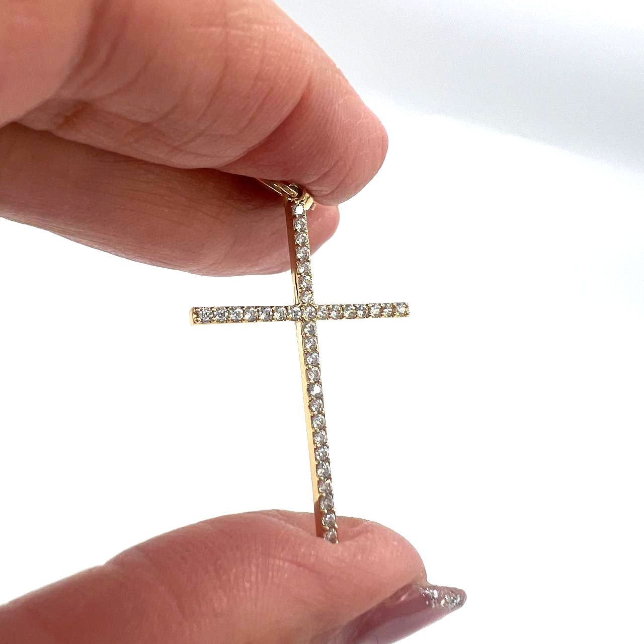 Experience timeless elegance with these 14K yellow gold cross earrings, crafted with a sleek and refined design that blends faith with fashion studded with zircon stones. Their delicate structure makes them perfect for everyday wear, while their polished finish adds a touch of sophistication to any outfit. Whether worn as a symbol of spirituality or as a modern statement piece, these earrings offer both style and meaning. Lightweight, versatile, and effortlessly chic, they are a must-have addition to every jewelry collection—ideal as a thoughtful gift or a personal treasure to cherish for years