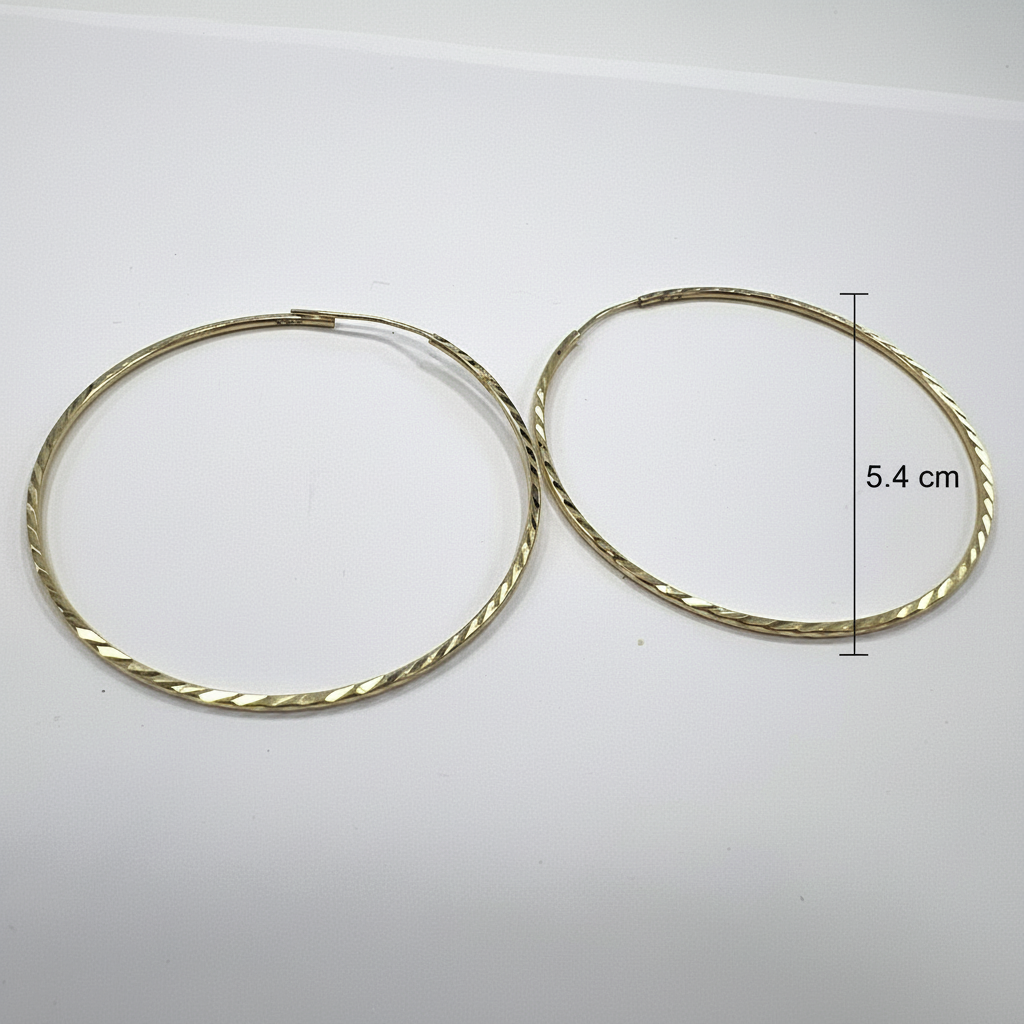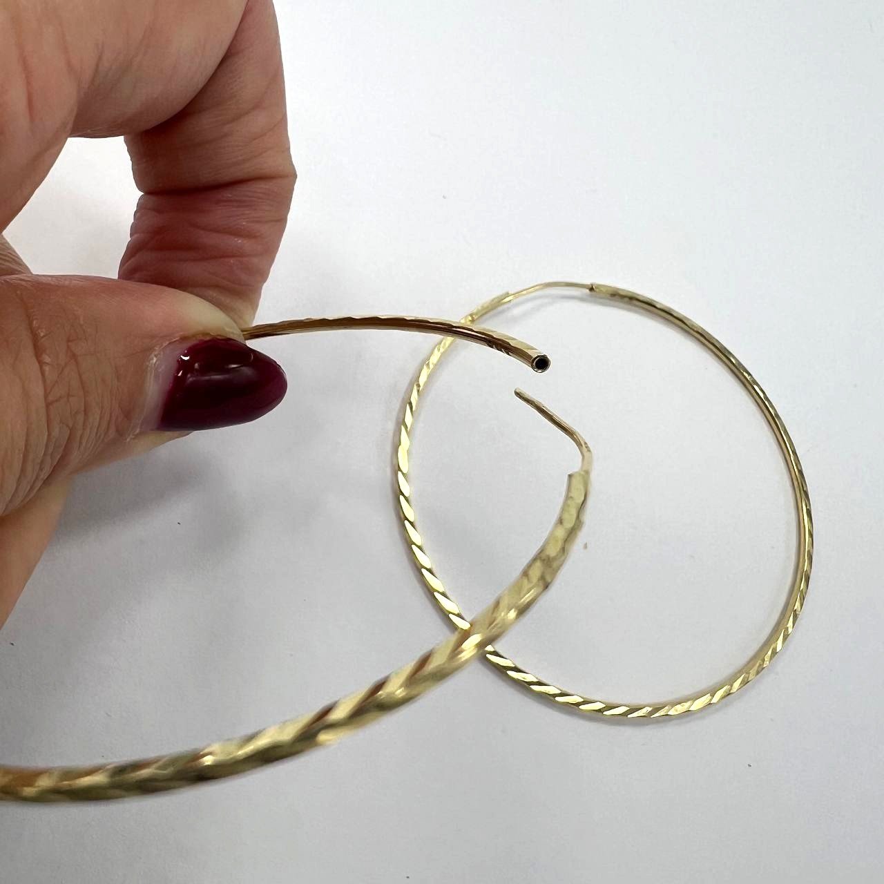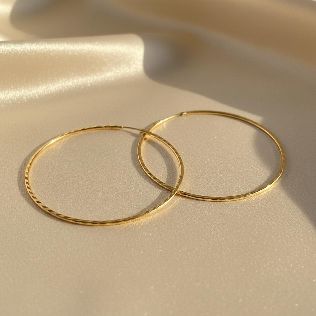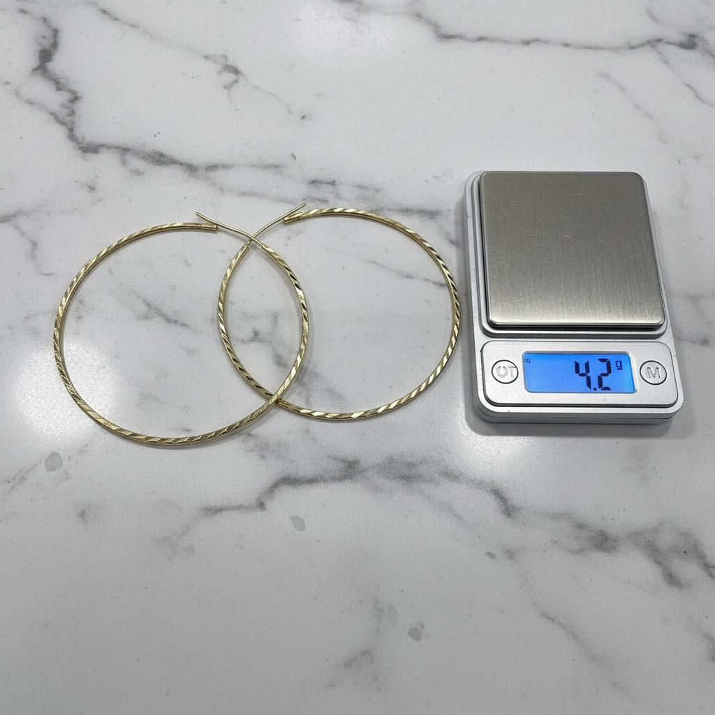 Discover the beauty of these classic and elegant hoop earrings, crafted from solid 14K yellow gold with exceptional craftsmanship and refined design. This elegant pair features a brilliant diamond-cut texture that beautifully reflects light for a dazzling, shimmering finish, making them perfect for everyday wear while offering a luminous and stylish look. Combining timeless charm with modern elegance, they add a sophisticated touch to any outfit, from casual daytime wear to evening elegance.