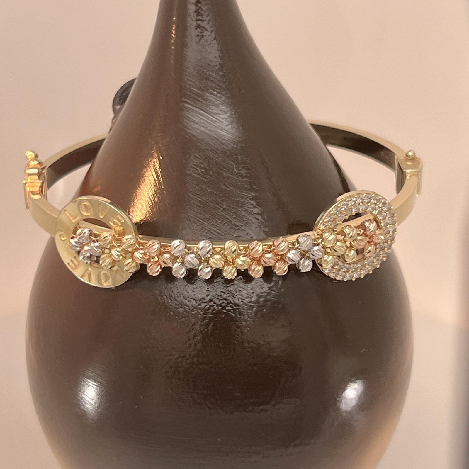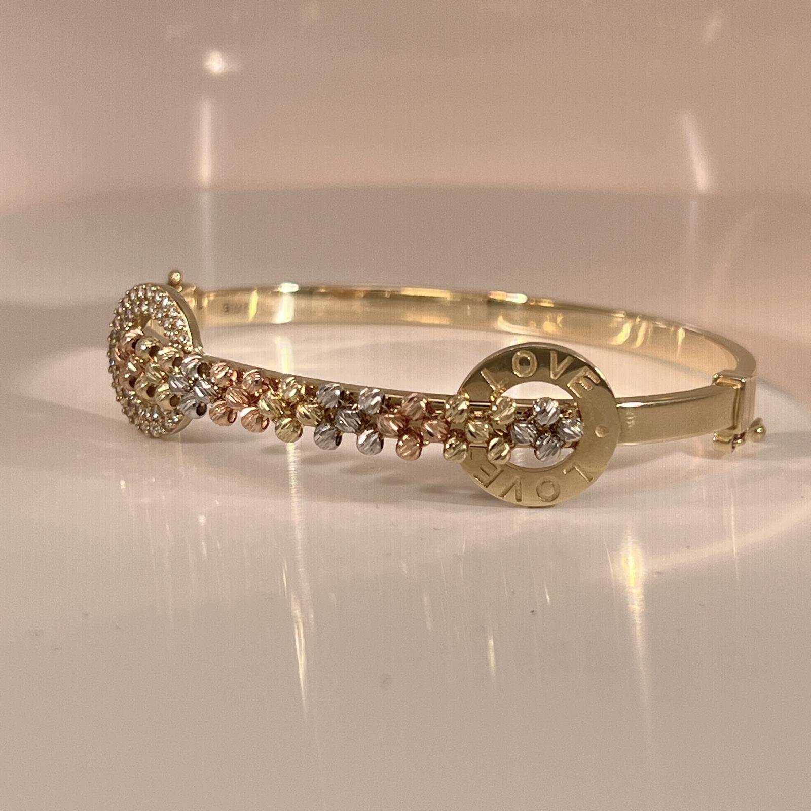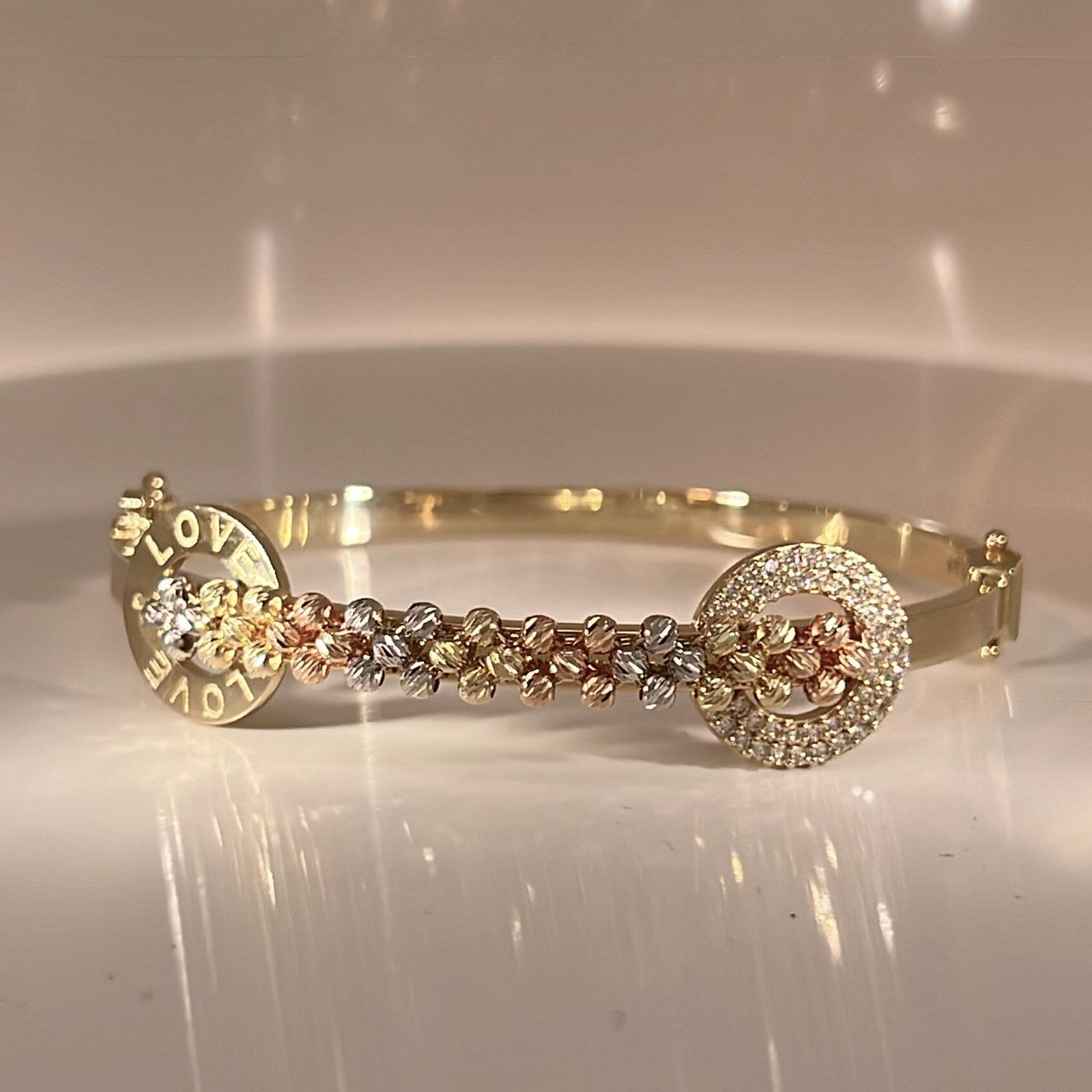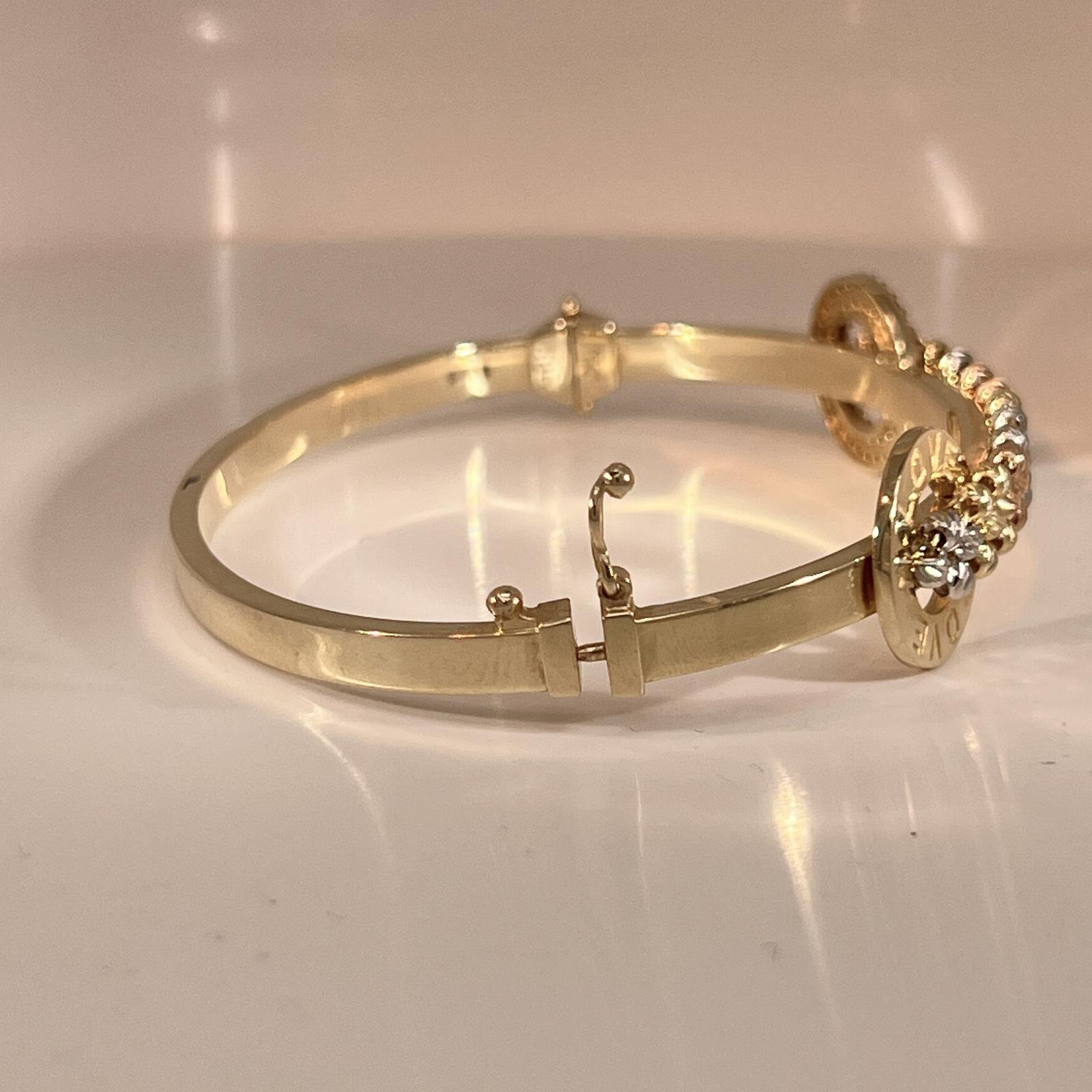 This bracelet is made of 14-carat gold and features an eye-catching design that brings together two prominent elements: