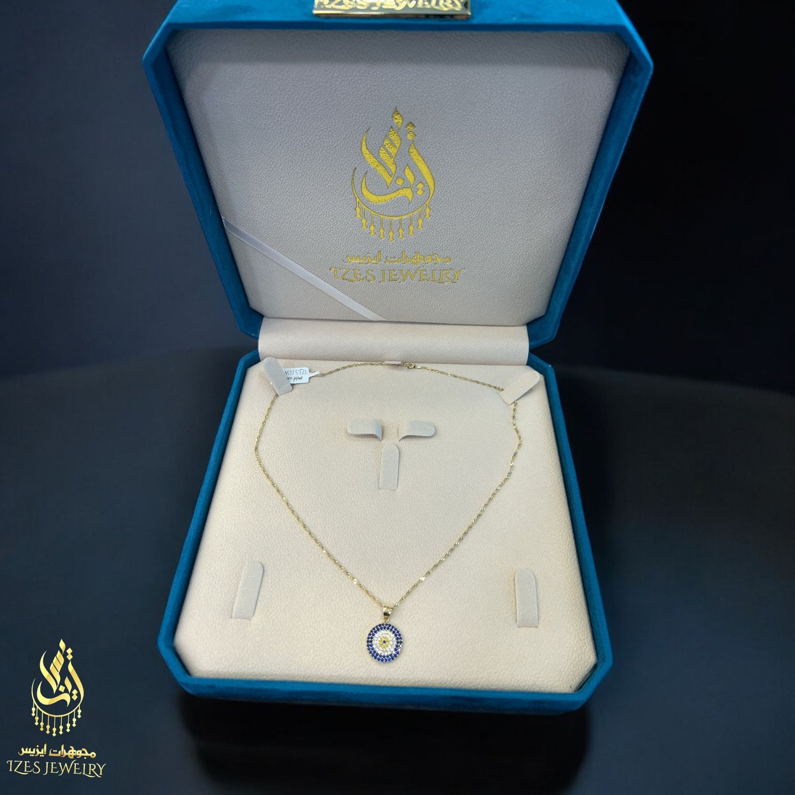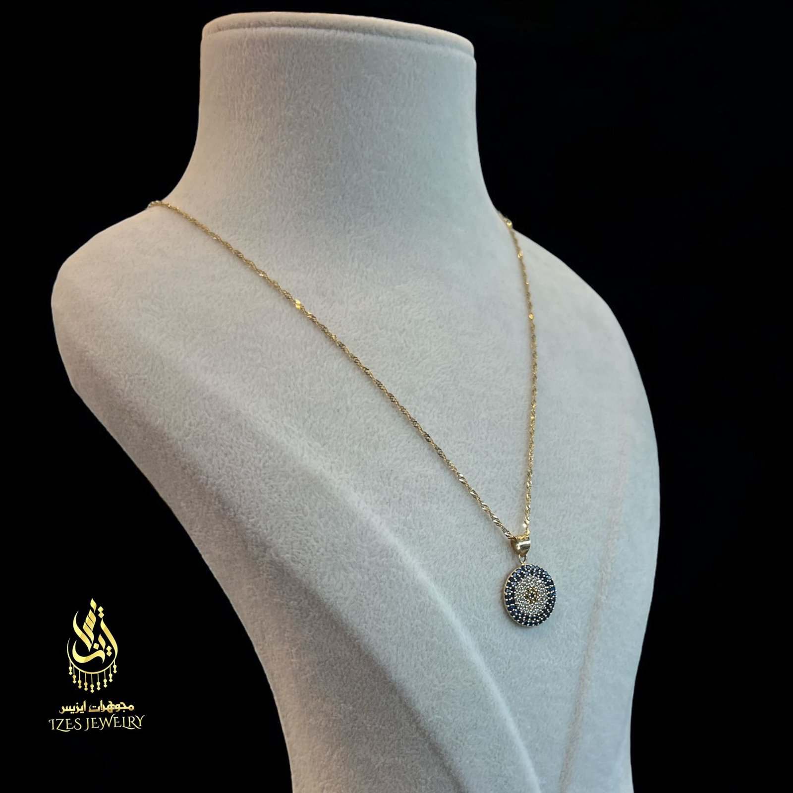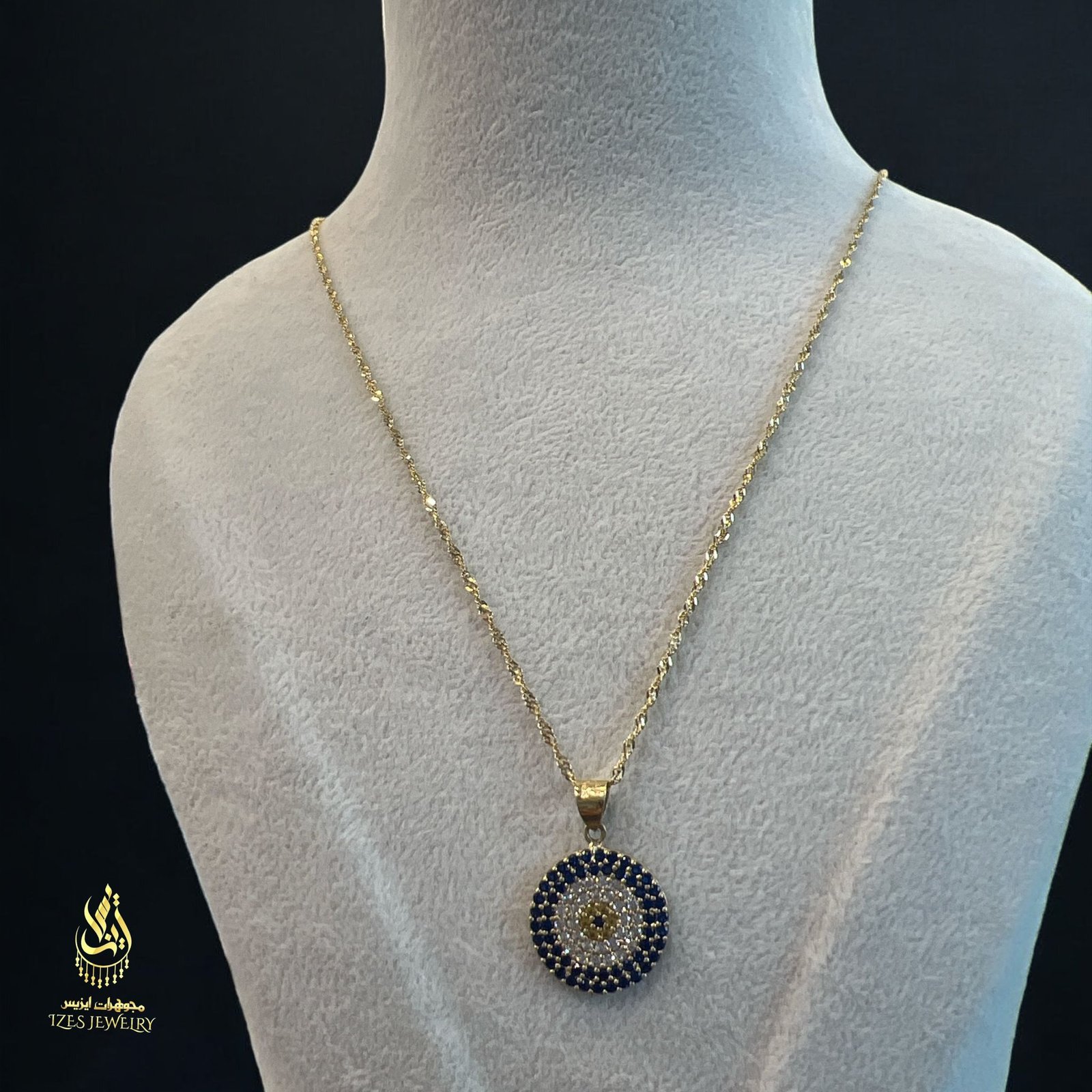 This beautiful necklace is crafted from 14-karat yellow gold, combining elegance and simplicity in a luxurious circular design. The pendant features multiple layers of carefully arranged stones that create a striking, eye-catching effect: