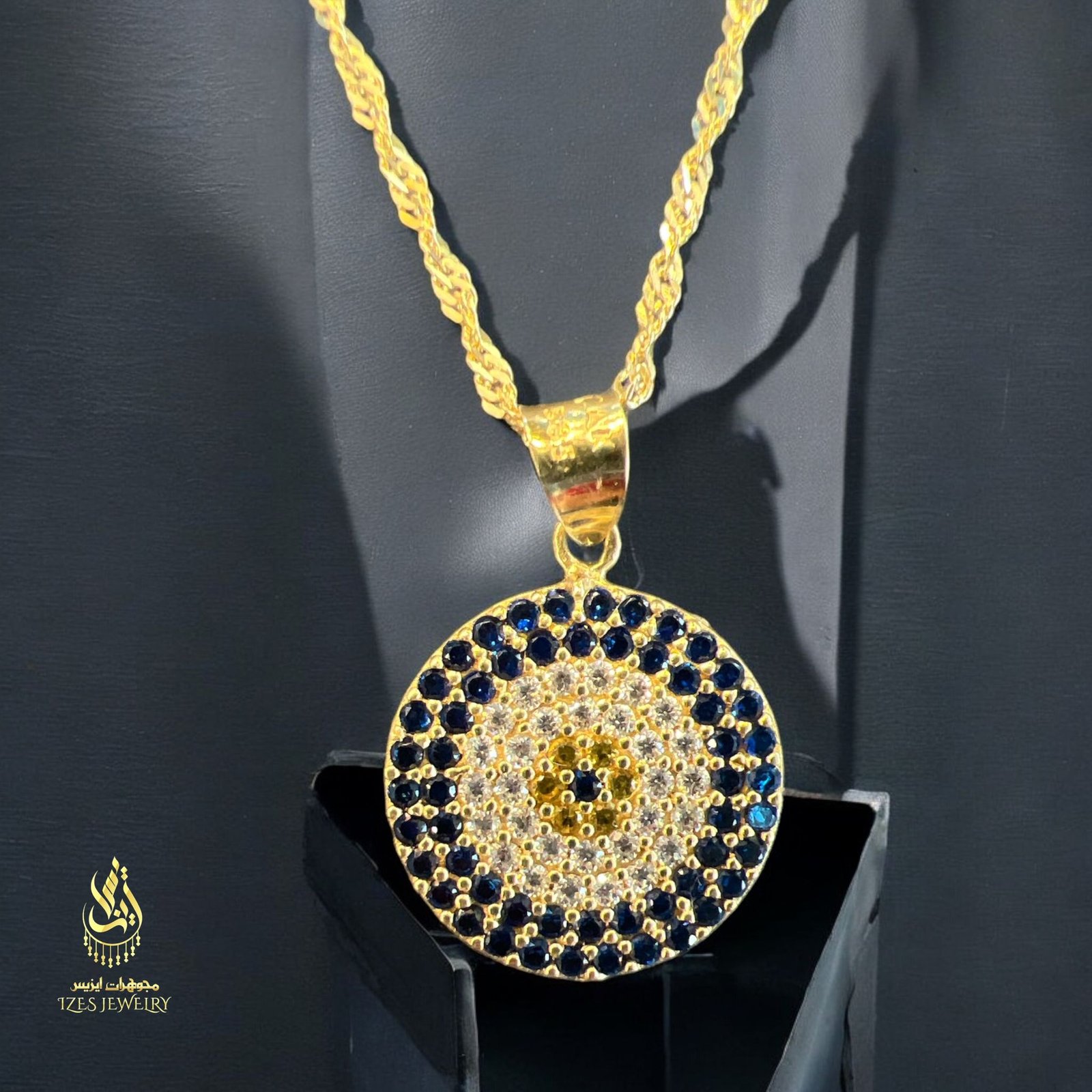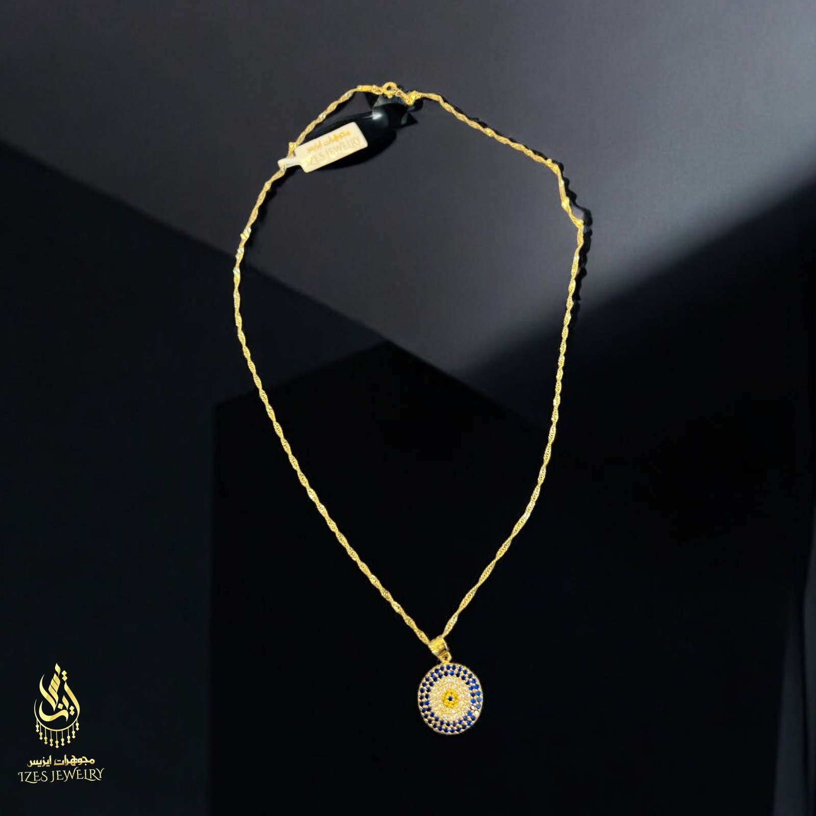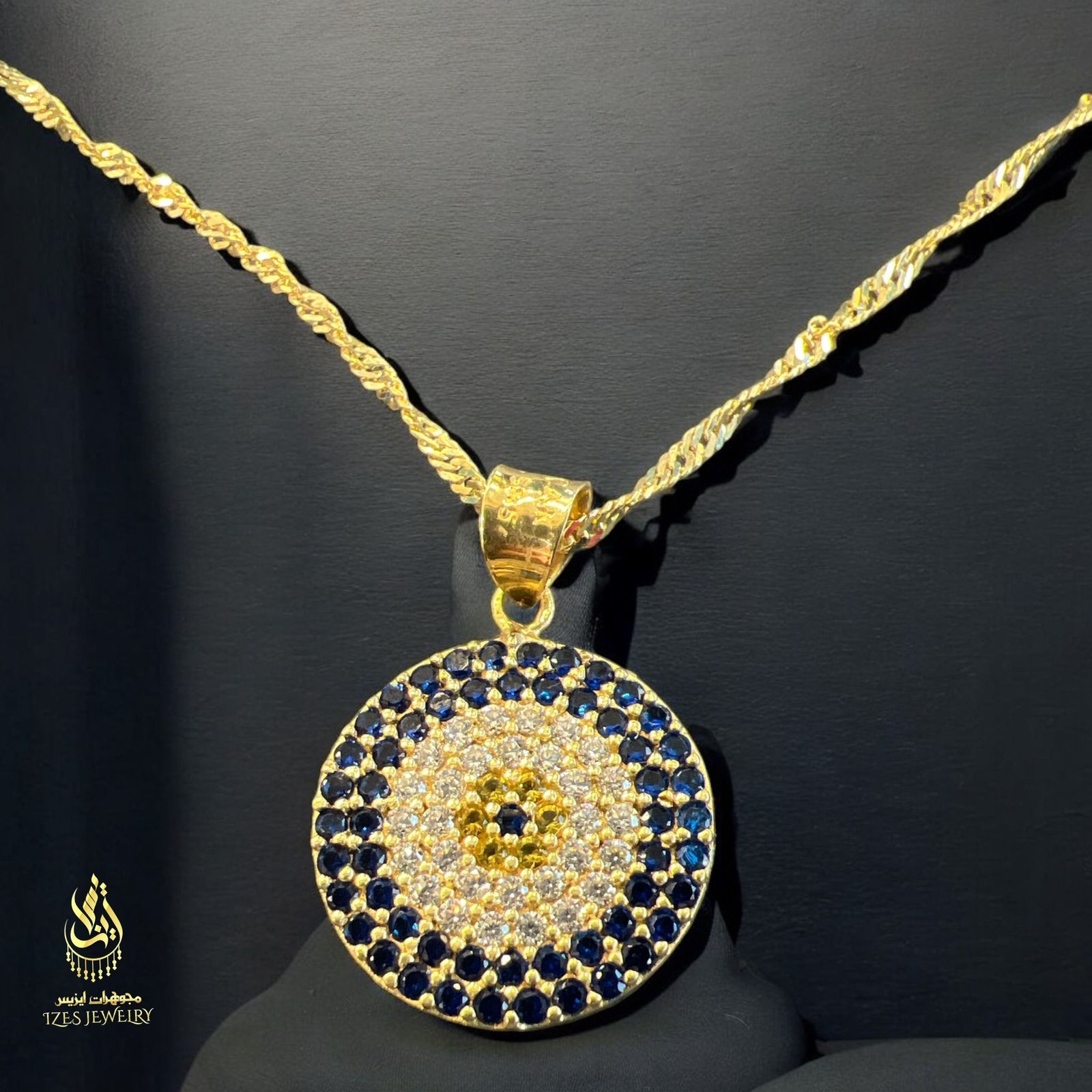 This beautiful necklace is crafted from 14-karat yellow gold, combining elegance and simplicity in a luxurious circular design. The pendant features multiple layers of carefully arranged stones that create a striking, eye-catching effect: