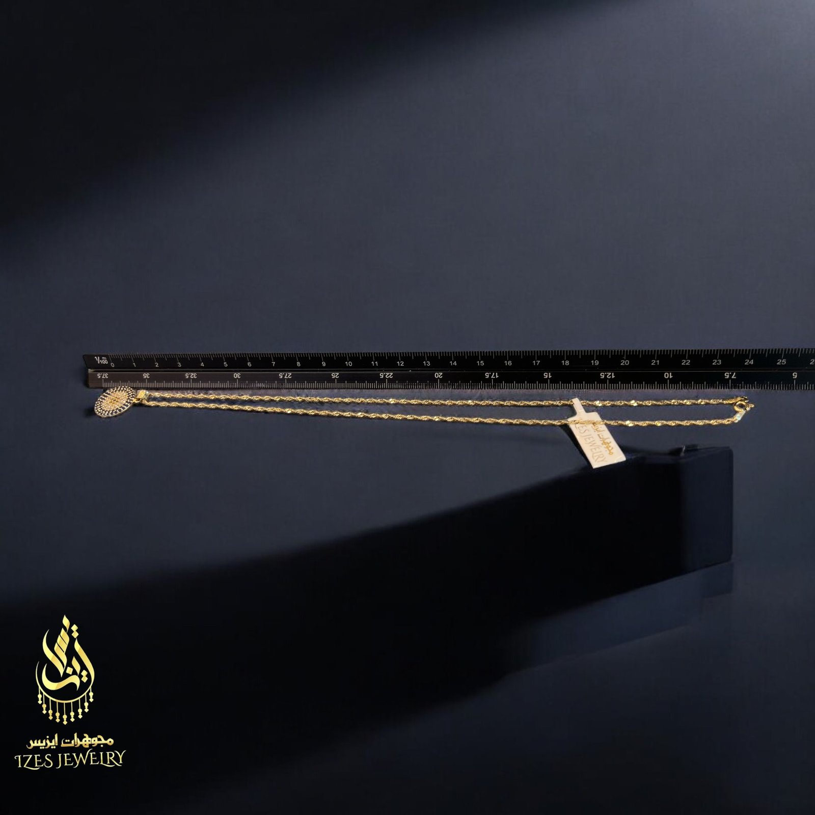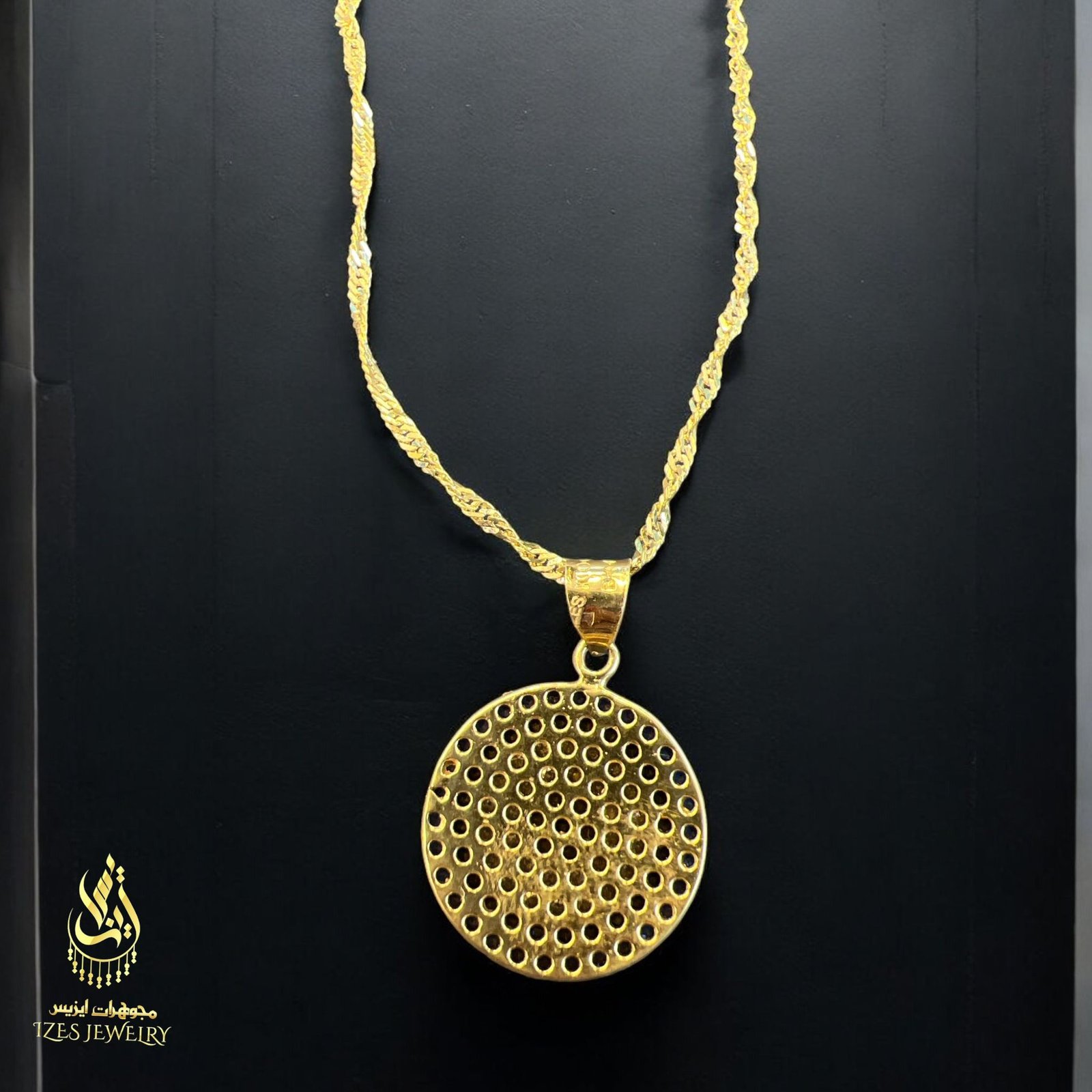 The gold chain is sturdy and twisted, complementing the pendant with a solid and elegant look.