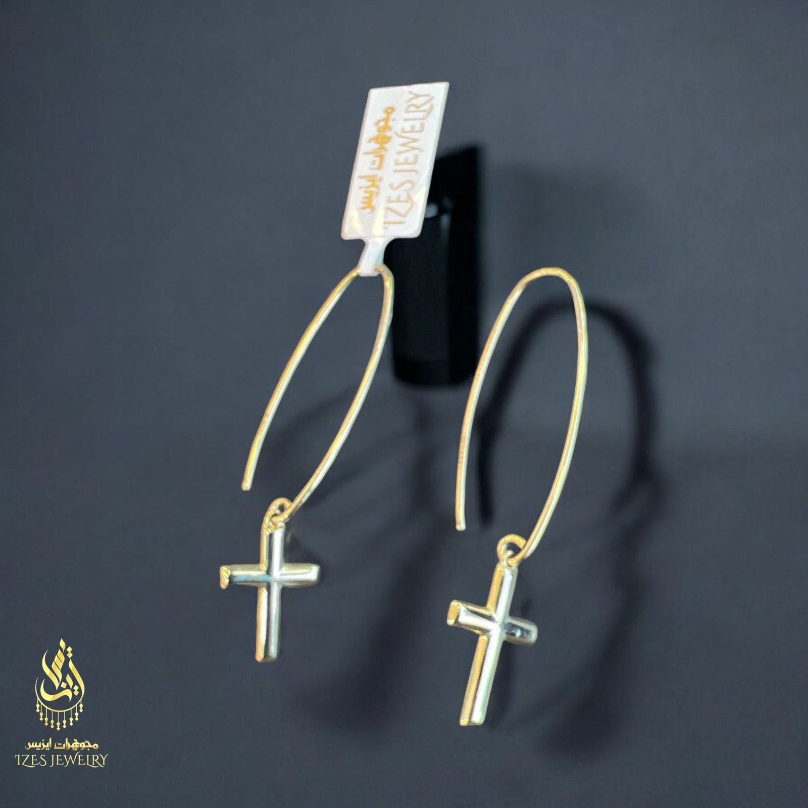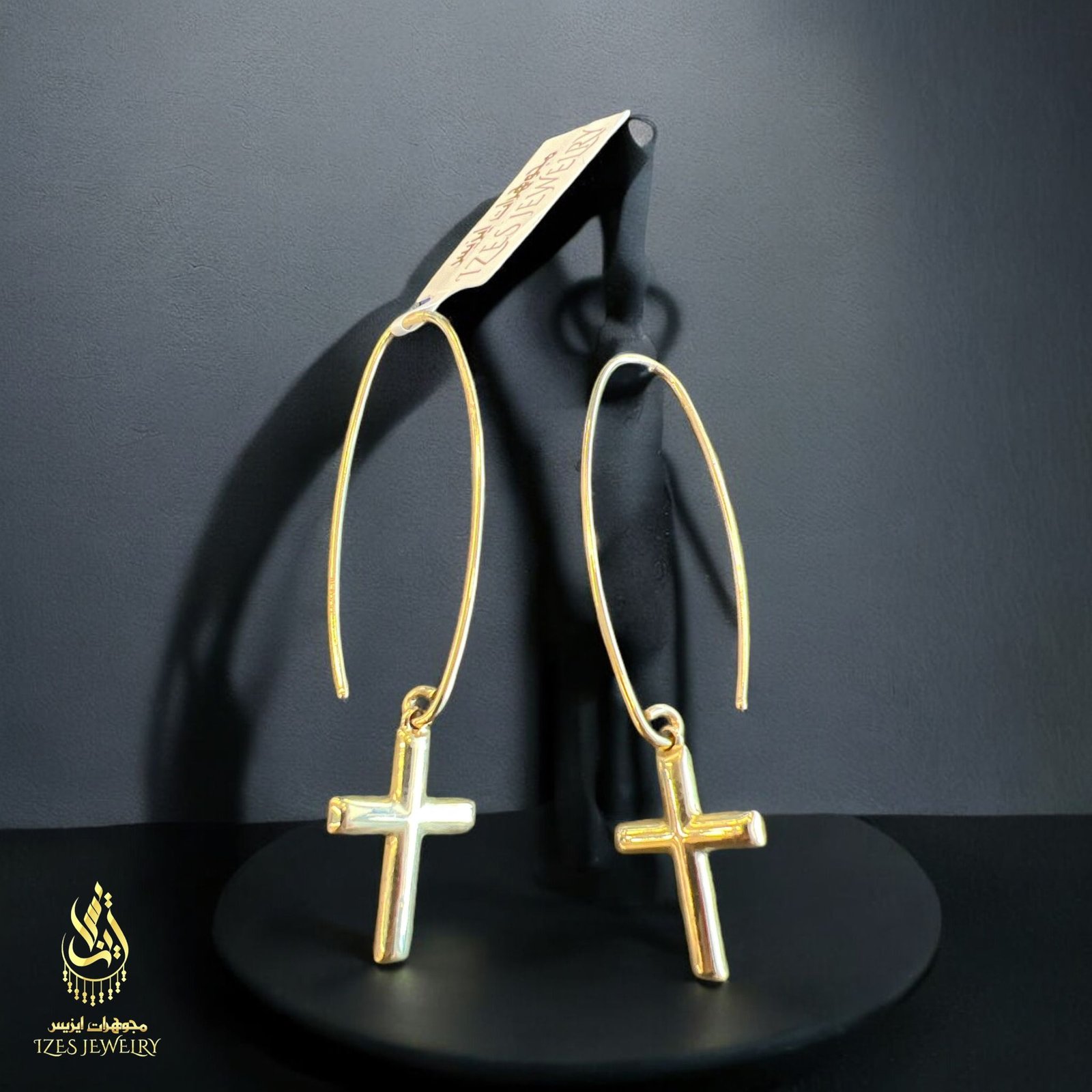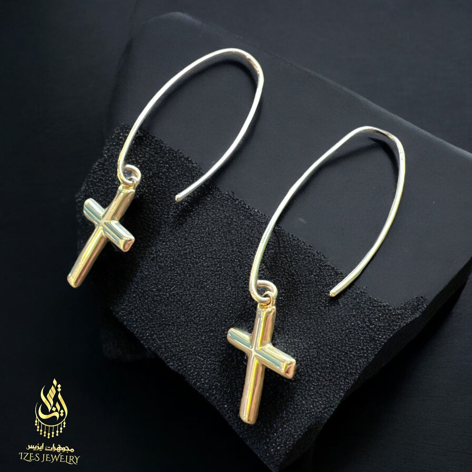 14K gold earrings with a simple and elegant design. A small, polished cross dangles from each earring, adding a symbolic and distinctive touch. The long hook gives the earrings a modern and flowing look, making them suitable for both everyday wear and special occasions.
