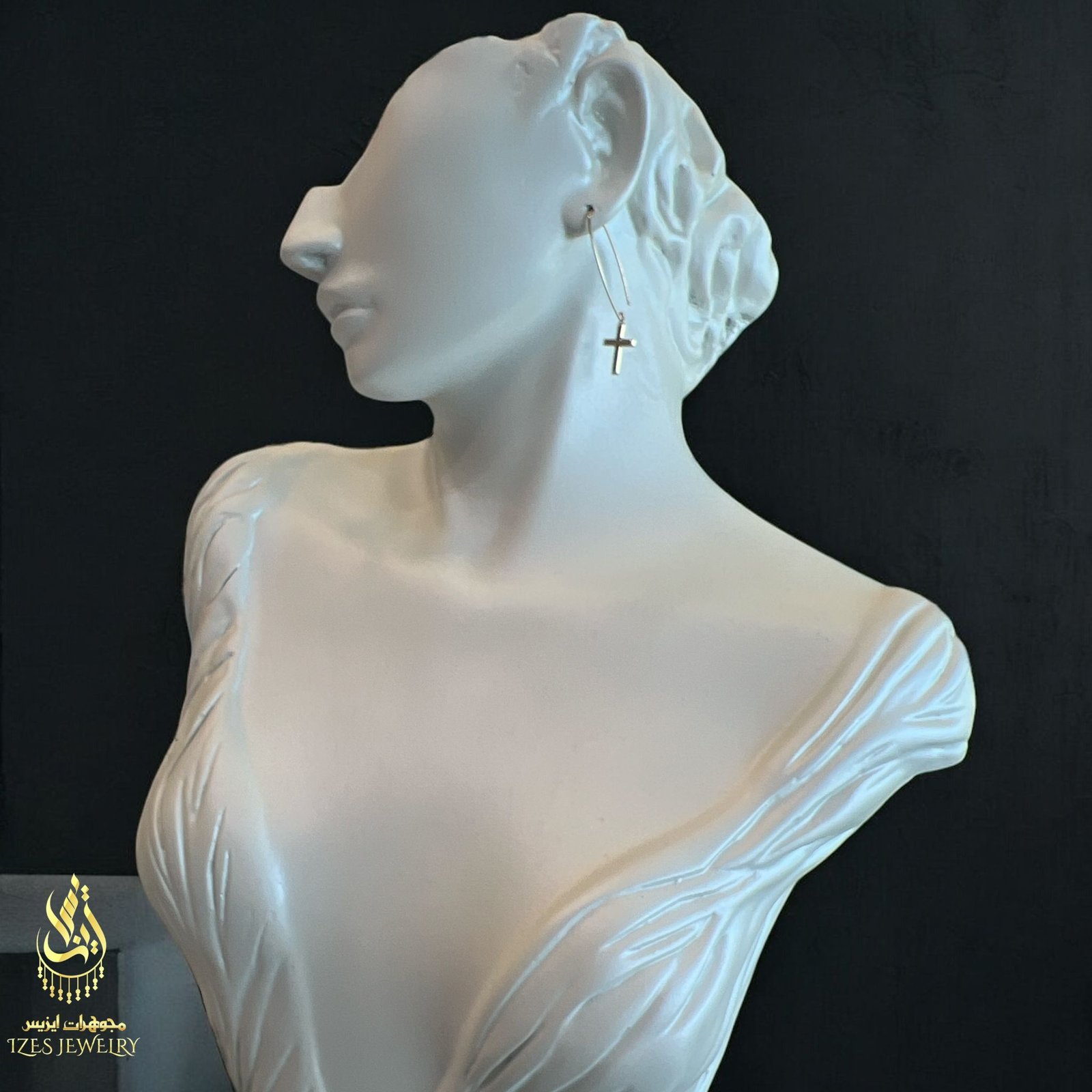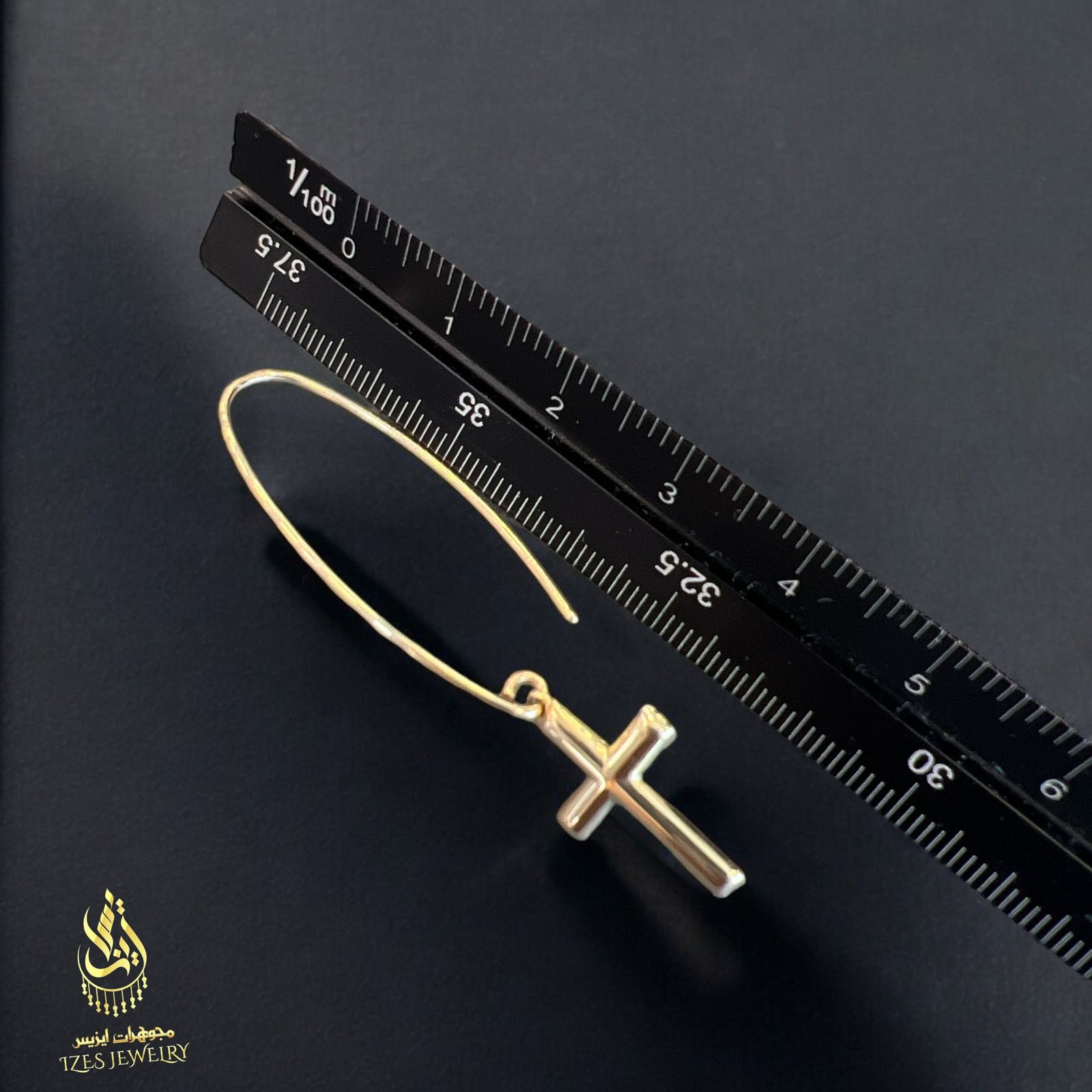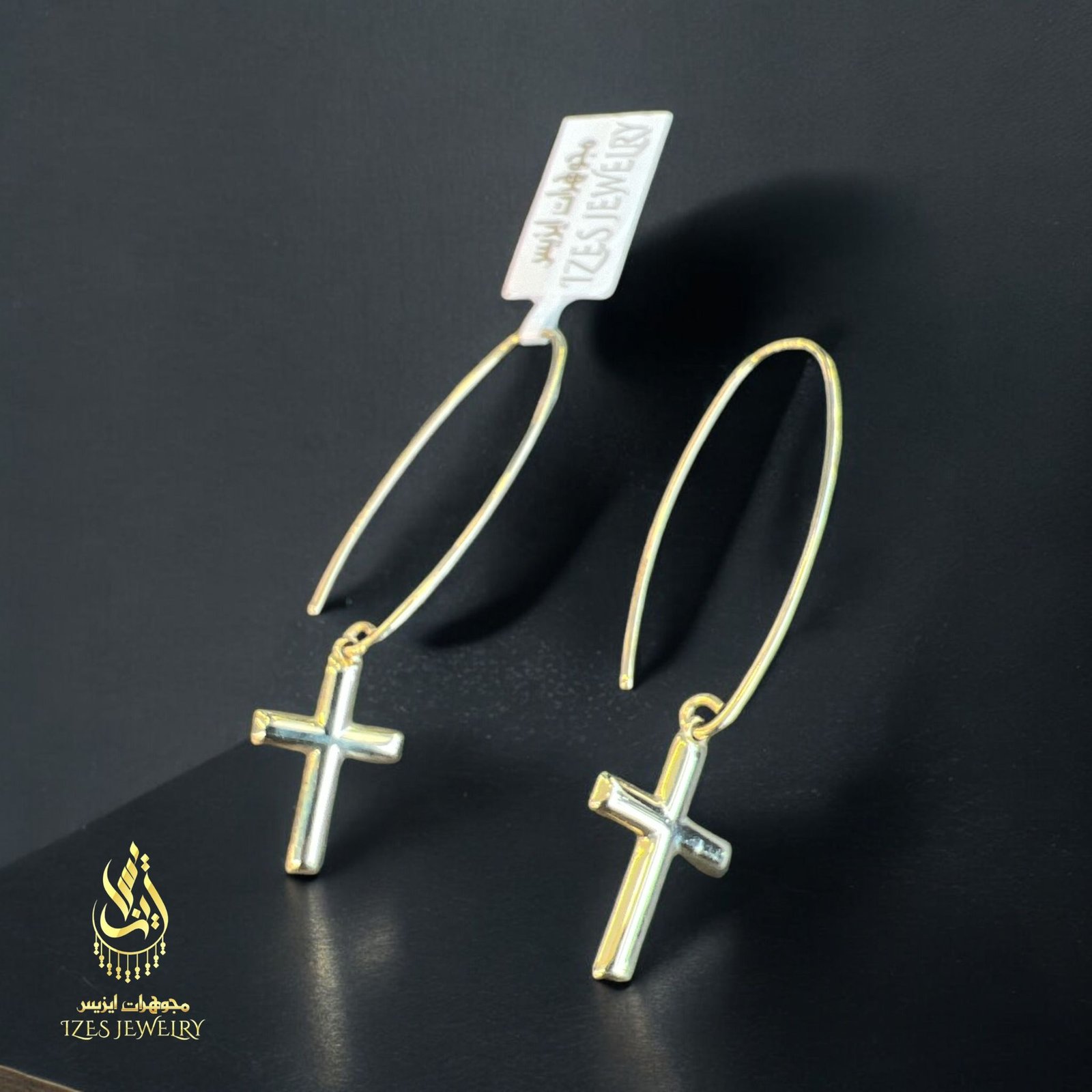 14K gold earrings with a simple and elegant design. A small, polished cross dangles from each earring, adding a symbolic and distinctive touch. The long hook gives the earrings a modern and flowing look, making them suitable for both everyday wear and special occasions.